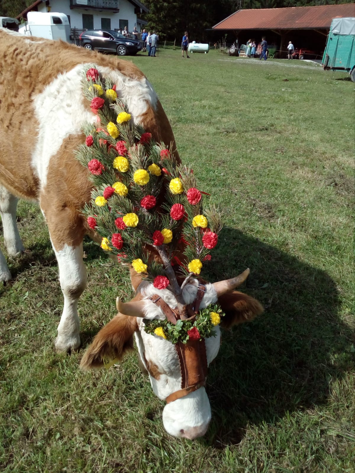 Bei einem unfallfreien Sommer werden die Tiere beim Almabtrieb im September noch "aufgekranzt", also mit Kopfschmuck versehen. Mittlerweile fast eine Rarität im Oberland.